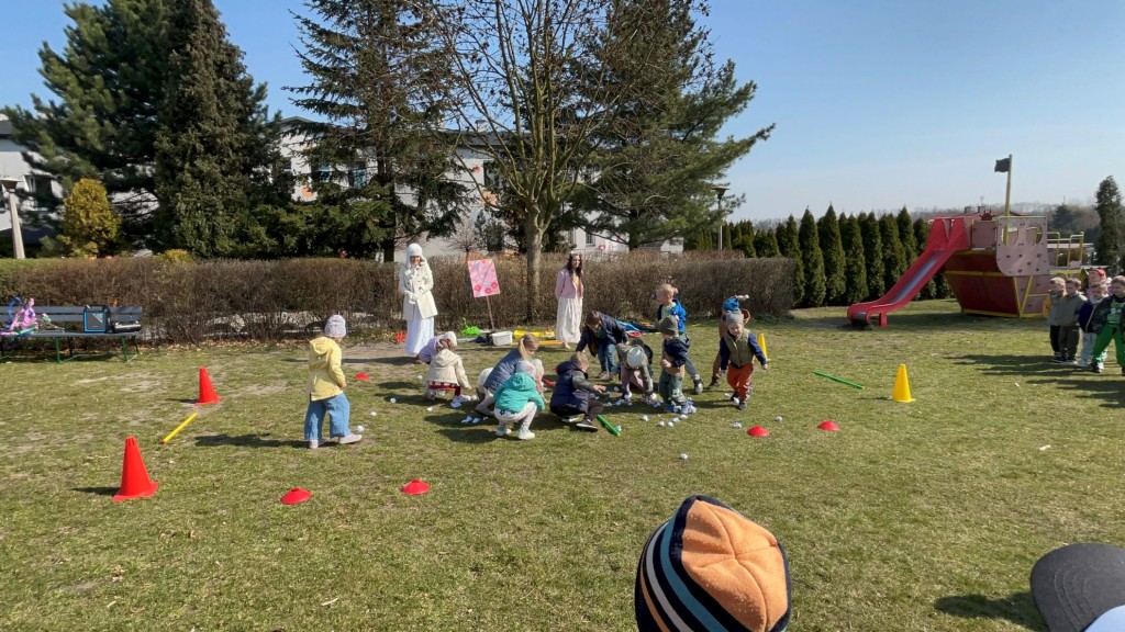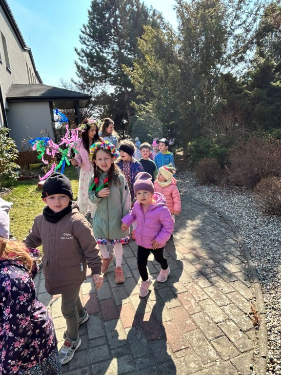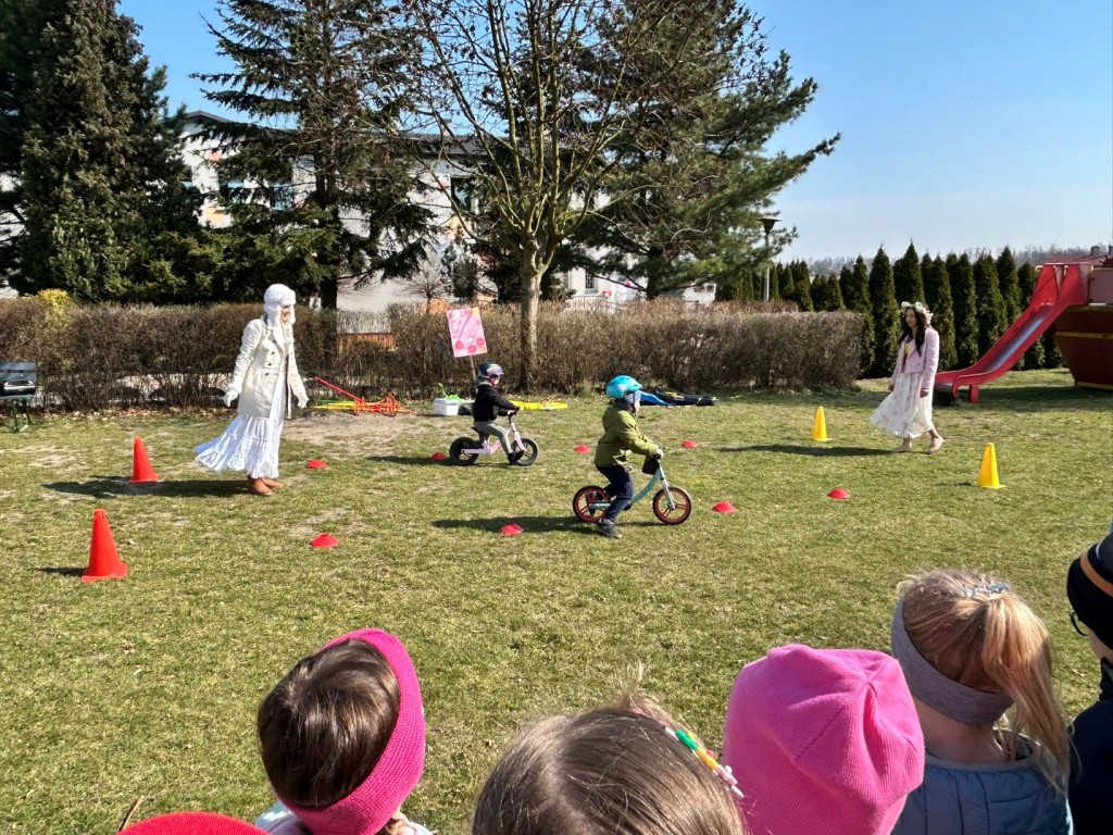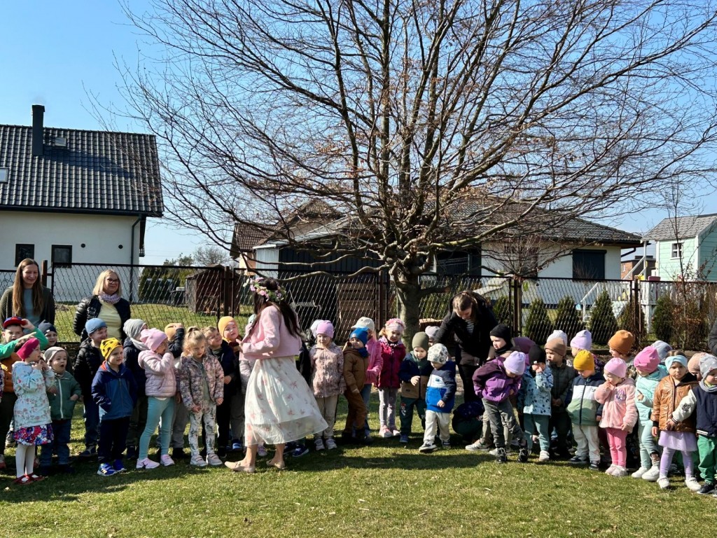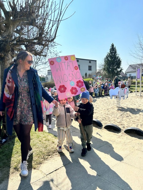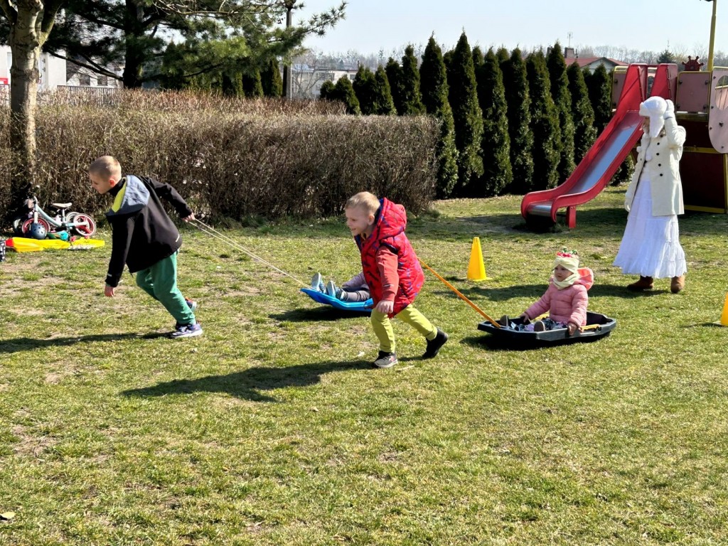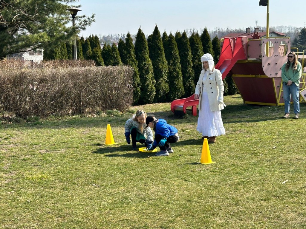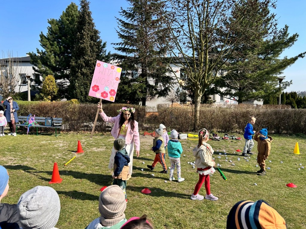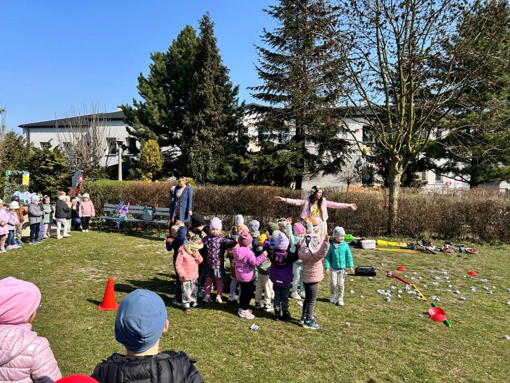 Z takim okrzykiem przywitaliśmy Panią Wiosnę, ale zanim to nastąpiło to na naszym palcu przedszkolnym rywalizowały ze sobą Pani Zima z Panią Wiosną podczas konkurencji sportowych. Dzielnie w tym wszystkim pomagały im przedszkolaki. Było dużo śmiechu i dobrej zabawy. Na koniec Liski i Biedronki zaśpiewały piosenkę, po której korowodem przeszliśmy wokół Przedszkola, wołając „Witaj Wiosno, żegnaj Zimo!”