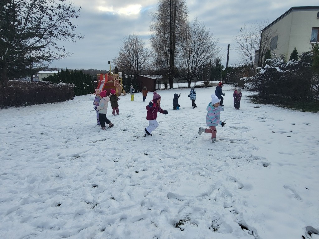 Pierwszy śnieg za oknem zachęcił wilczki do zabaw na świeżym powietrzu.