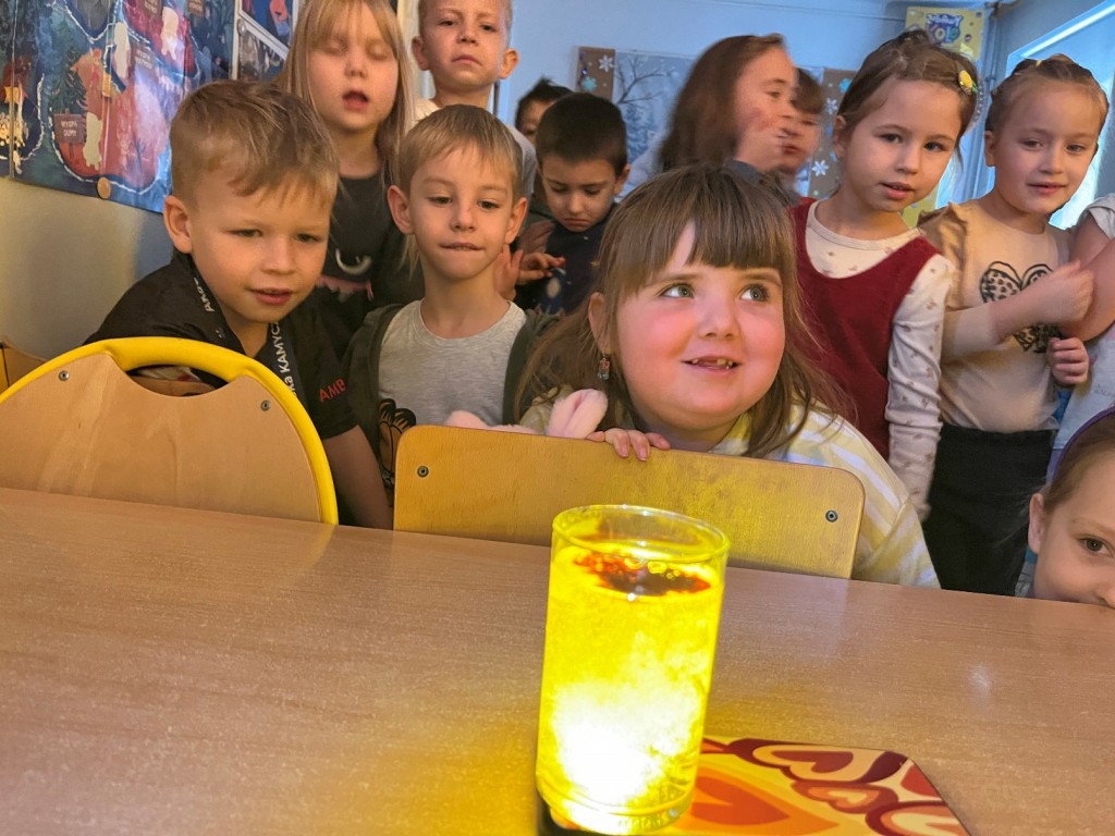 Wysłuchaliśmy bajki i piosenki tytułowej oraz zrobiliśmy doświadczenie z kurkumą i latarką.